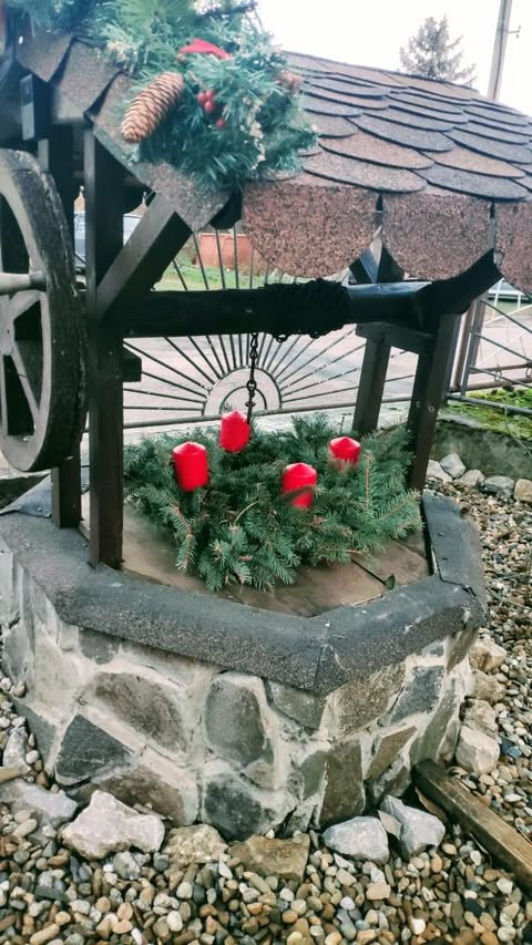 Proč zdobit jen dům a zádveří, když venku je tolik míst, která se dají převléknout do adventního kabátku. Zeleno červený adventní věnec této studni moc sluší.