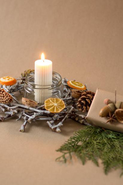 I když nemáte k dispozici chvojí nebo jiné přírodniny, dokážete vytvořit pěkný adventní svícen.