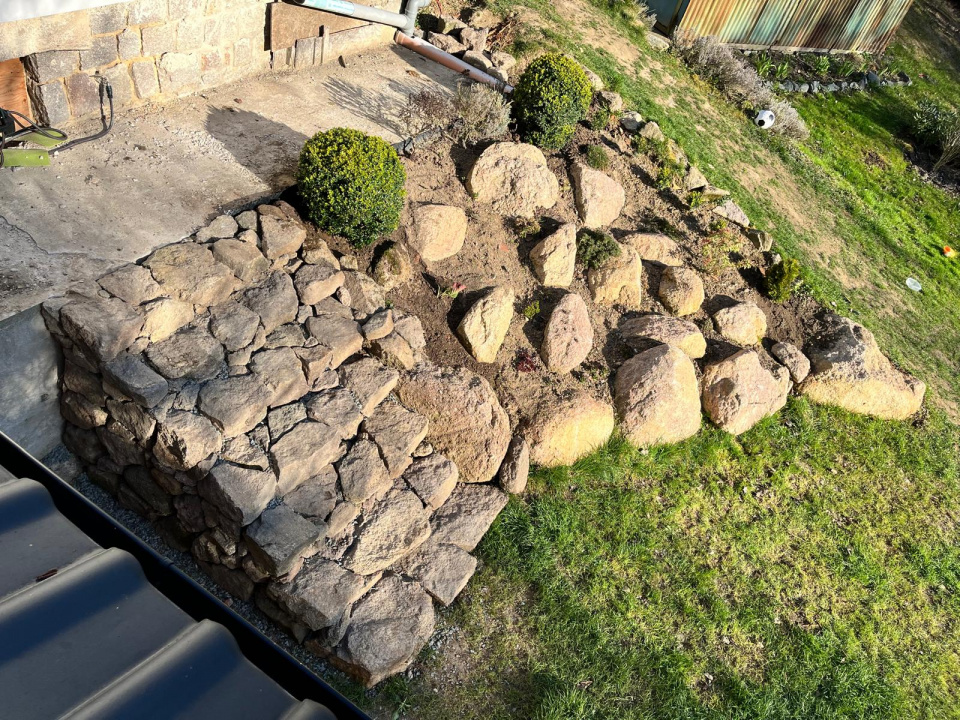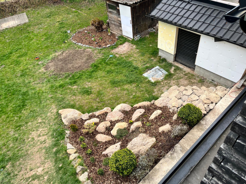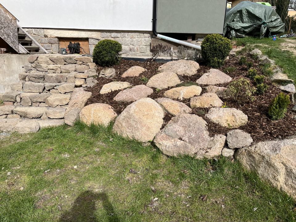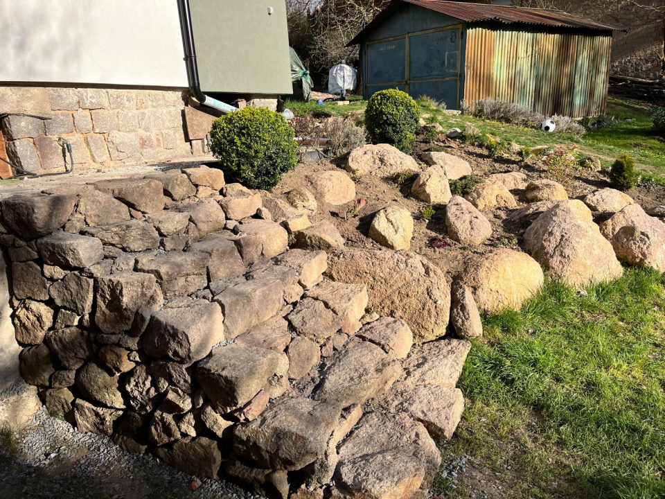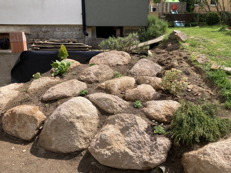 Soused se kamenů rád zbavil a ochotný pan bagrista pomohl upravit terén zahrady a ty největší z kamenů usadit na správné místo