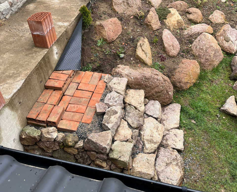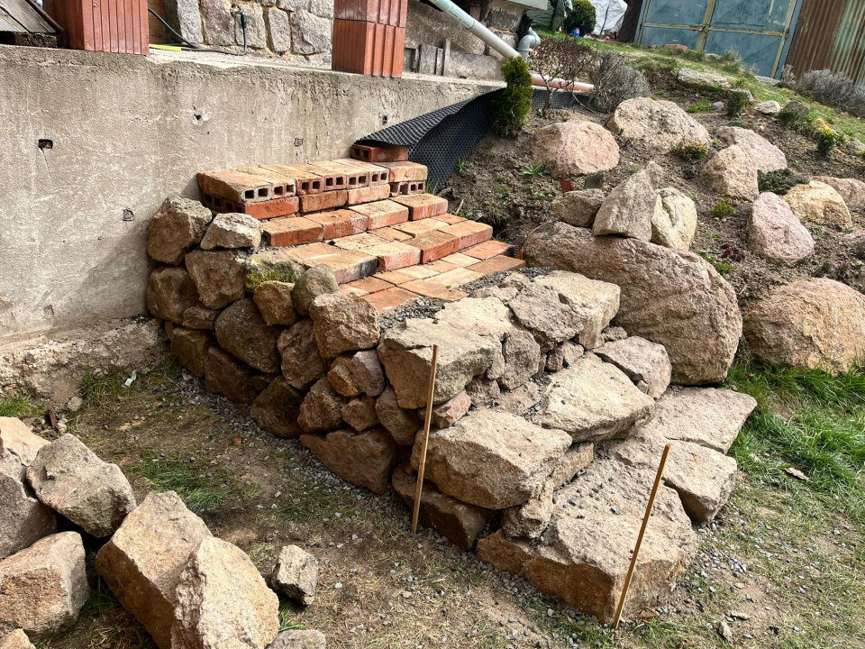 Menšími kameny, zbylými ze stavby skalky, jsou schody jenom obložené