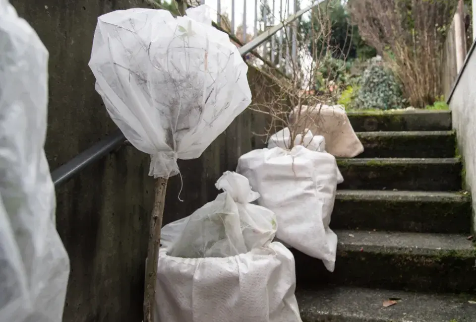 Bílou netkanou textilií obalte korunky mladých stromků i květináče, abyste ochránili kořeny