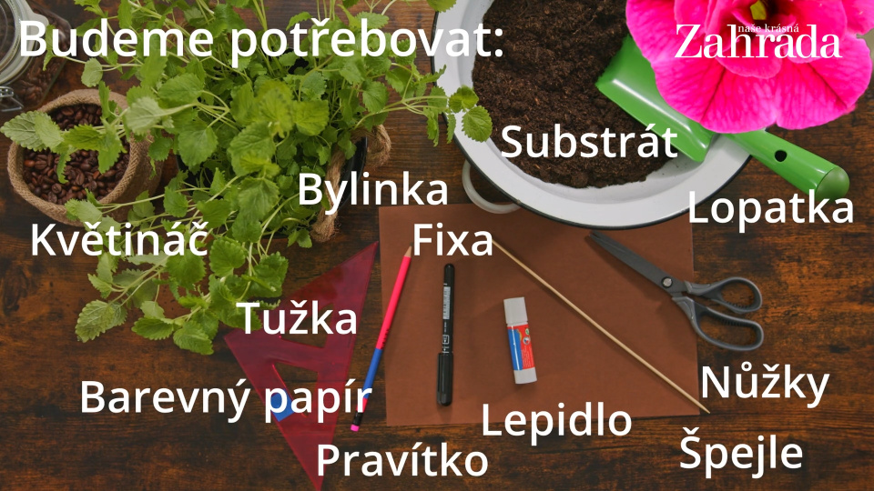 Co budete potřebovat na bylinkový květináč se jmenovkou? Připravte si zahradnický substrát, zahradnickou lopatku, prostornější květináč, bylinku, barevný papír, tužku, pravítko nebo trojúhelník s ryskou, černý fix, špejli, nůžky, tyčinkové lepidlo