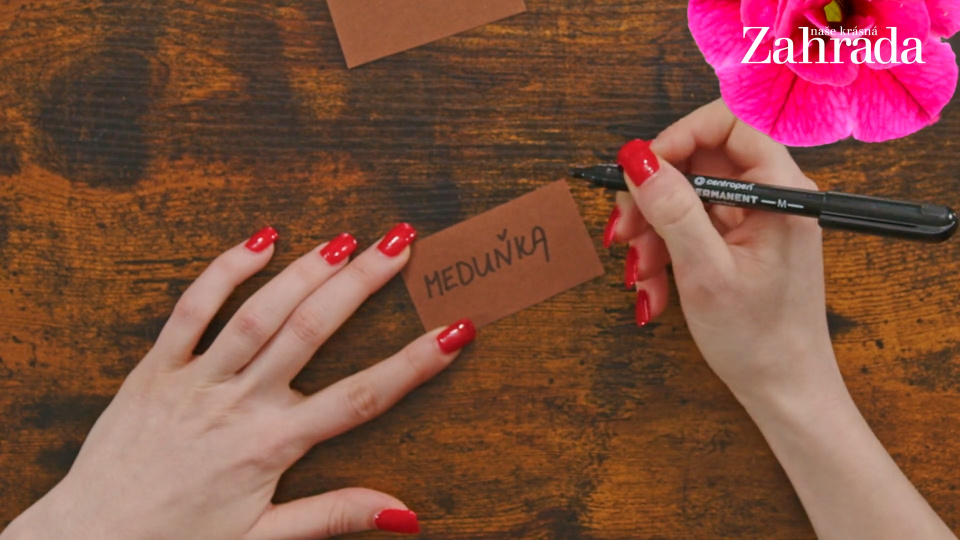 Na jeden z obdélníků napište černým fixem jméno bylinky, v našem případě je to meduňka