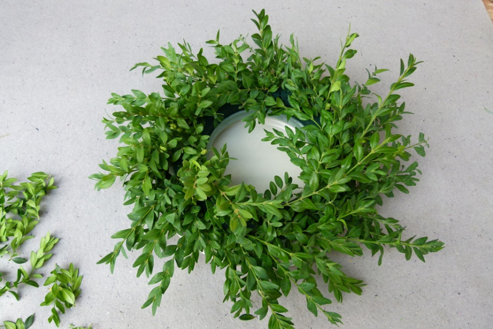 Základ na věnce z živých rostlin z aranžovací hmoty florex namočte, aby důkladně nasákl vodou, ve které jste předtím rozmíchali výživu pro řezané rostliny, a pak ho položte na větší plochý talíř. Nastříhejte větvičky buxusu na délku asi 15 cm a napíchejte je nejprve po celém obvodu věnce, a pak pokryjte i horní plochu.