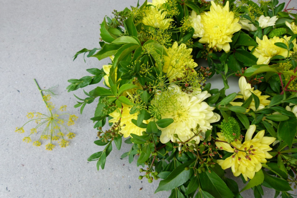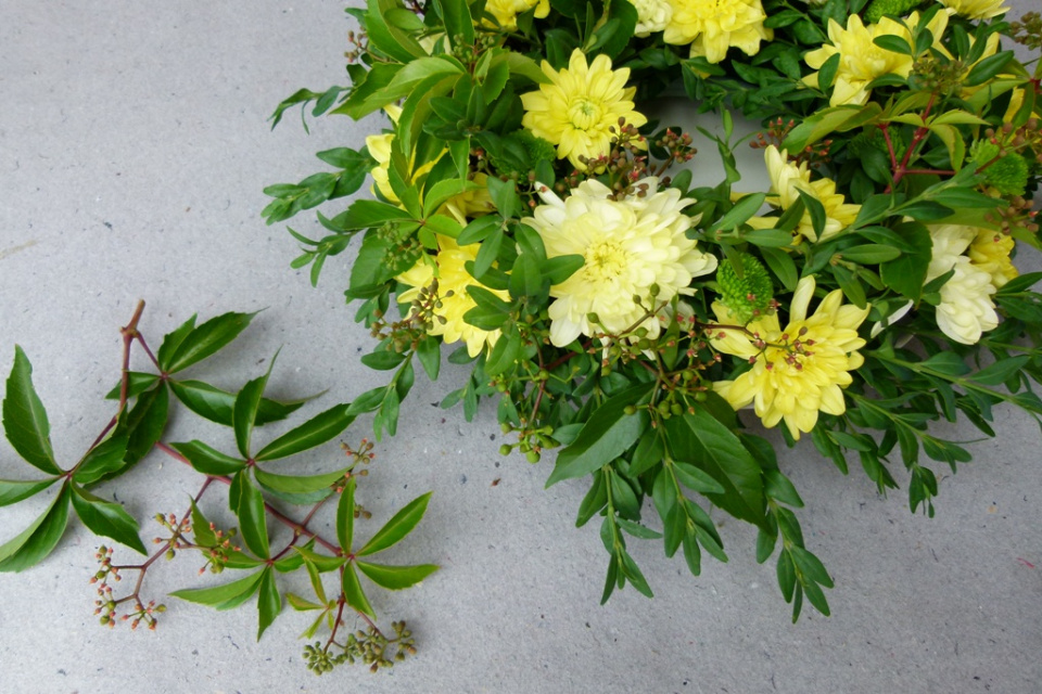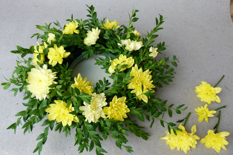 Do celé plochy věnce napíchejte i květy žlutých chryzantém a doplňte je i drobnými kvítky chryzantém zelených, zvaných santini