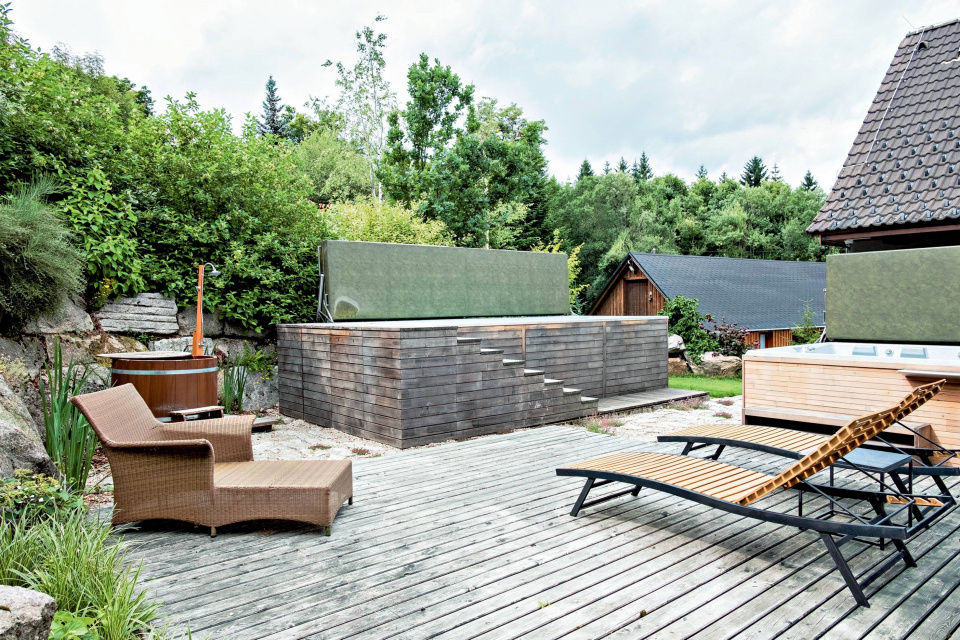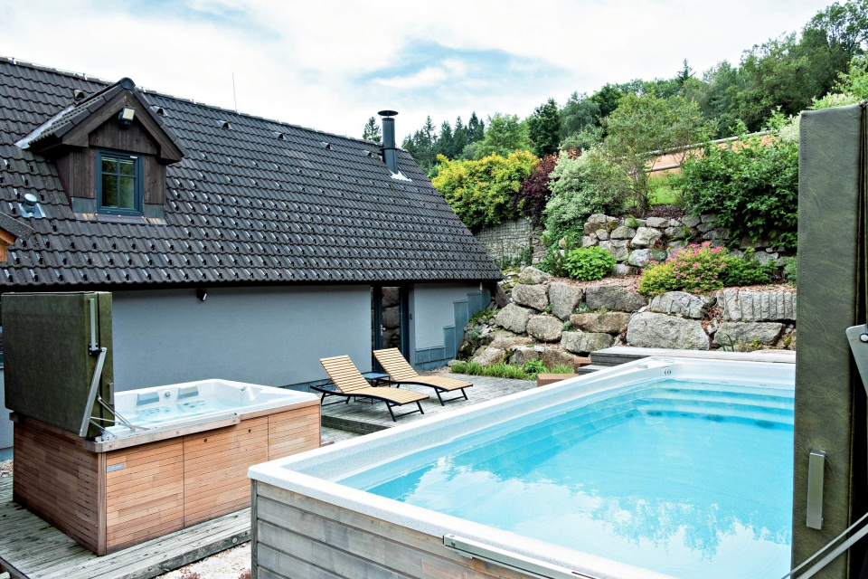 Krytý bazén a vířivka jsou blízko u domu začleněny tak, aby nerušily.