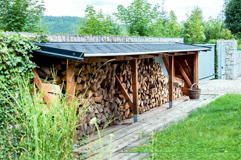 Modřínový dřevník má „záda“ tvořená zídkou zpevněnou suchým betonem.