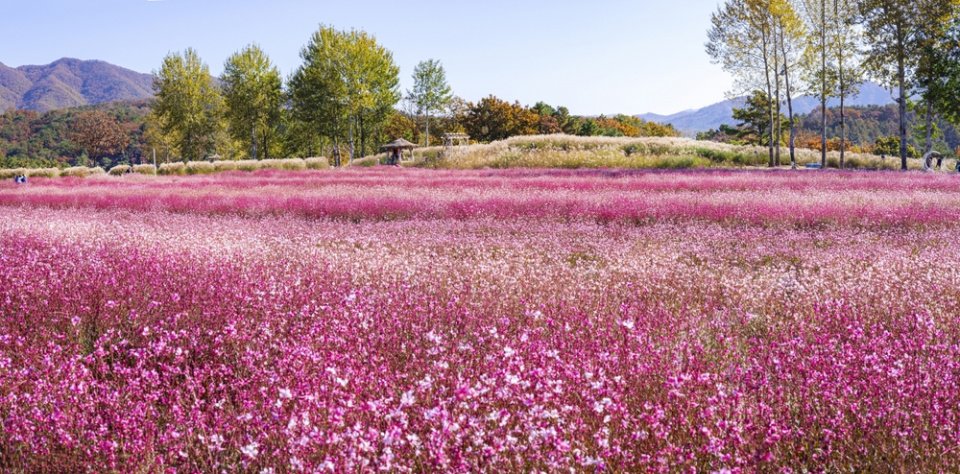 Úchvatný pohled na růžové květy gaury v květinové zahradě Goseokjeong v Jangheung-ri poblíž Cheorwon-gun, Jižní Korea