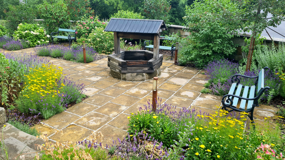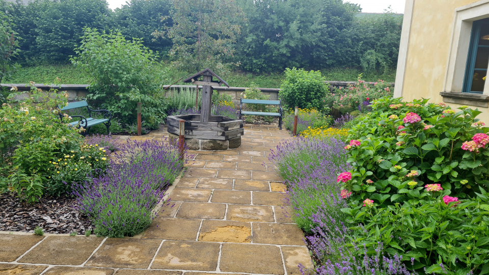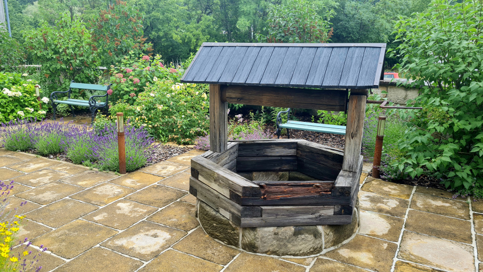 Ve středu zahrádky stojí dřevěná zábrana ke studni. Zahrádka poskytuje několik míst k posezení a překrásnou podívanou na již zarostlé záhony.