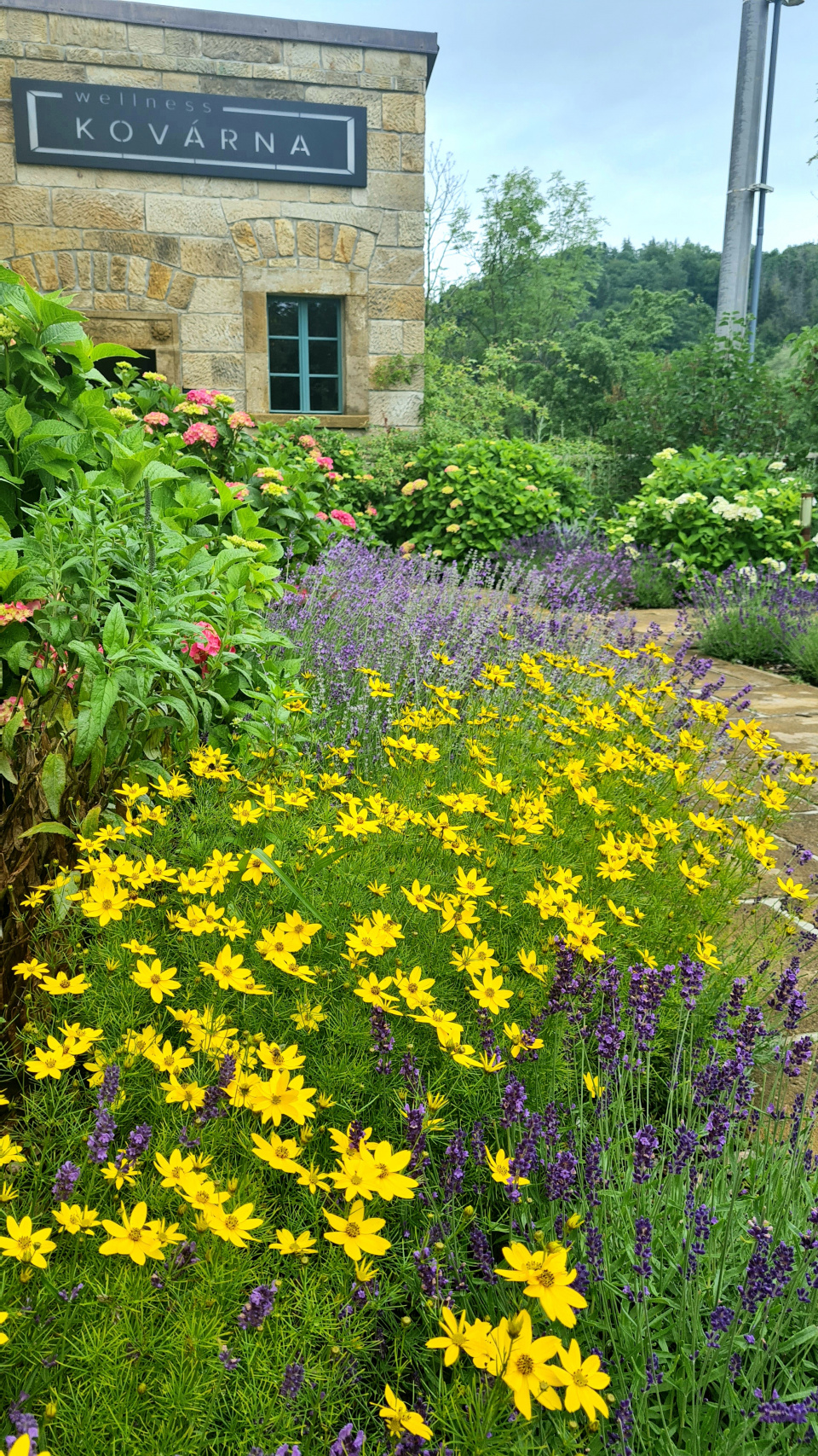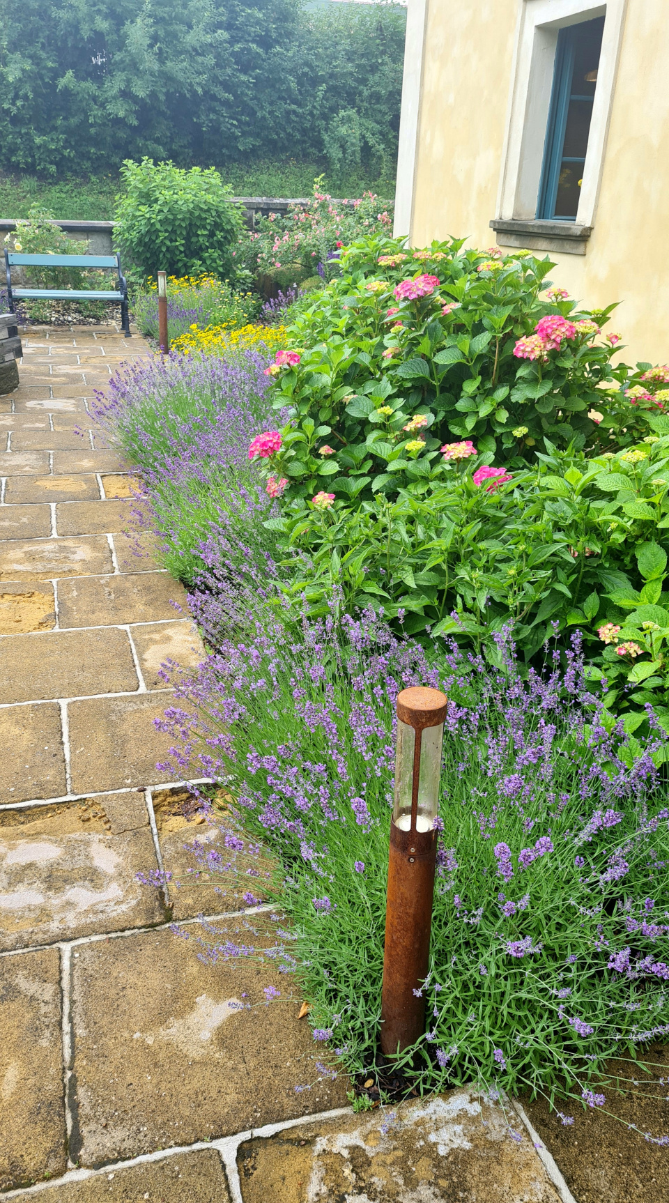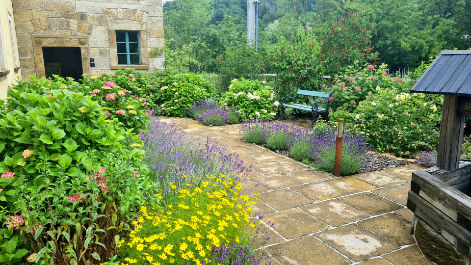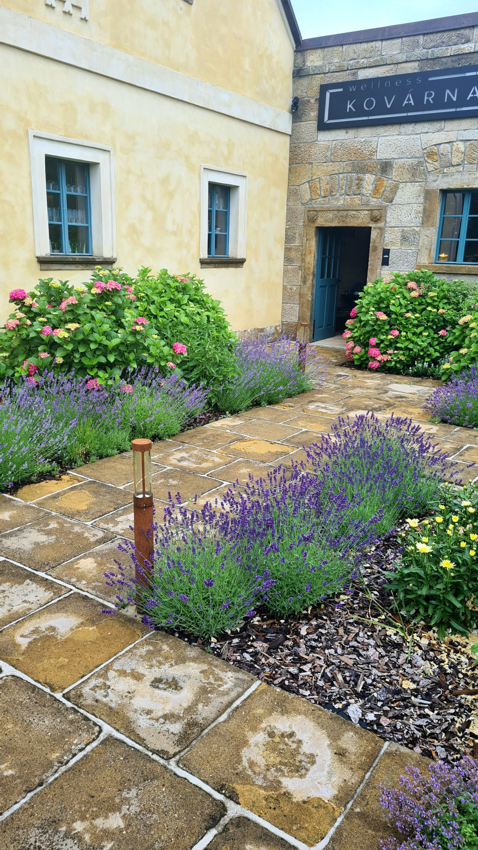 Harmonická kombinace: pískovec, levandule, krásnoočko a hortenzie.