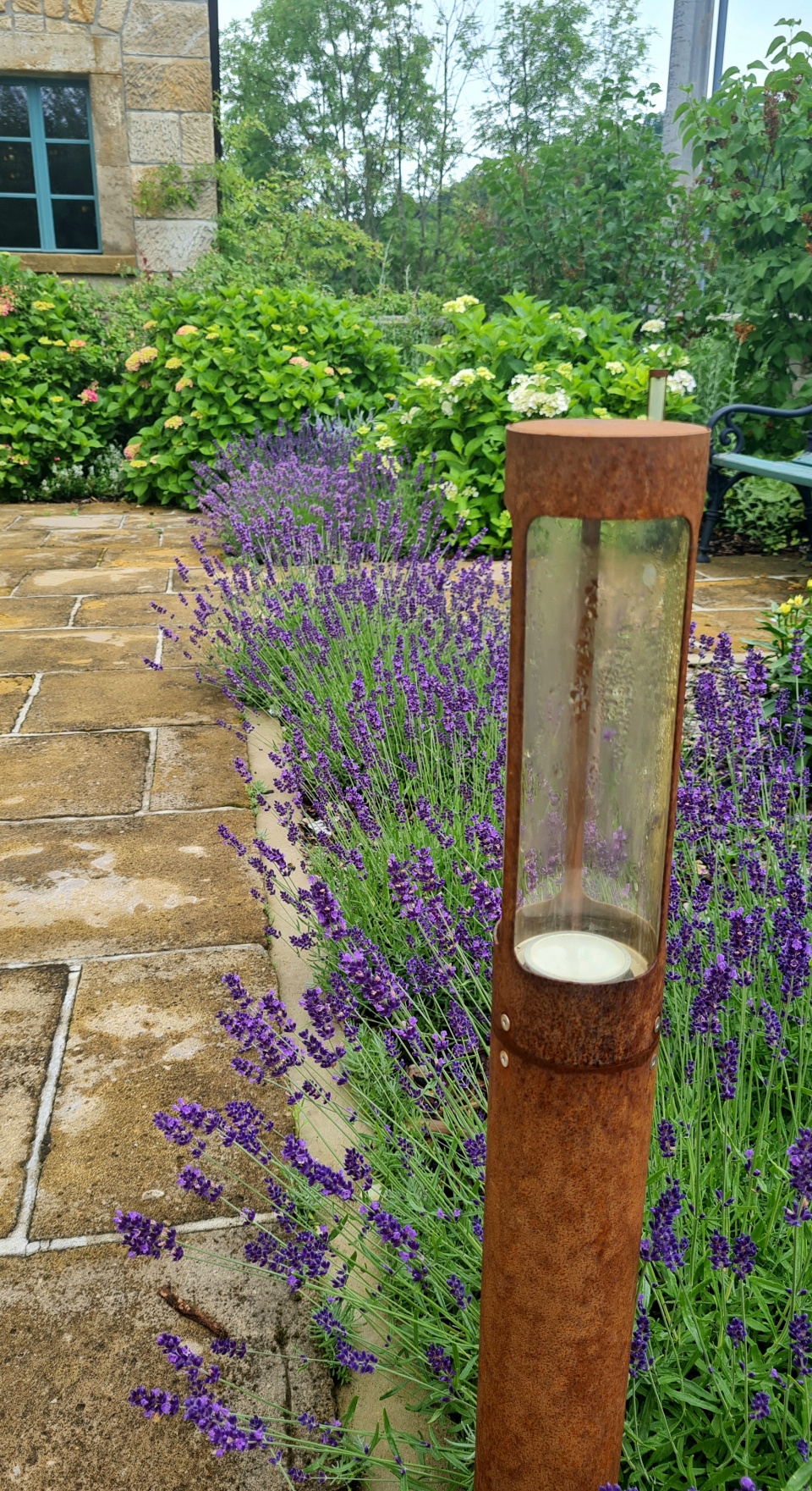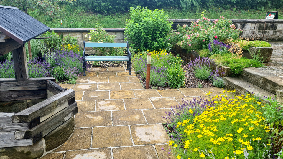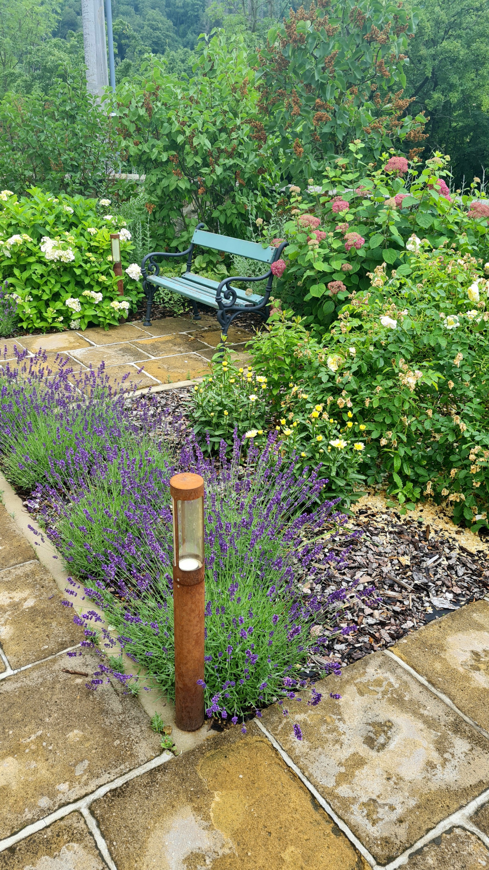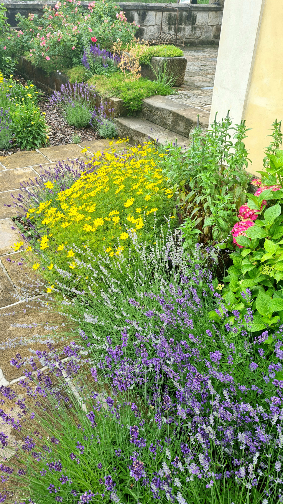 Harmonická kombinace: pískovec, levandule, krásnoočko a hortenzie.