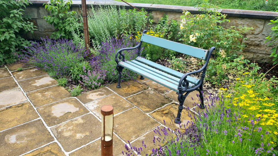Další lavička pod již odkvetlými šeříky, mezi hortenziemi, růžemi, levandulí a žlutými kopretinami.