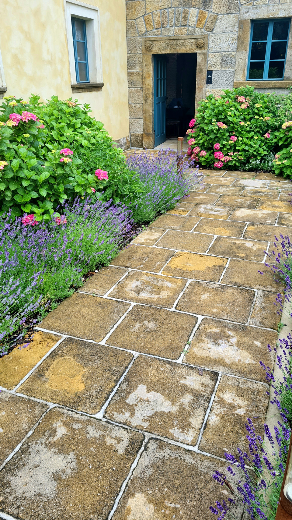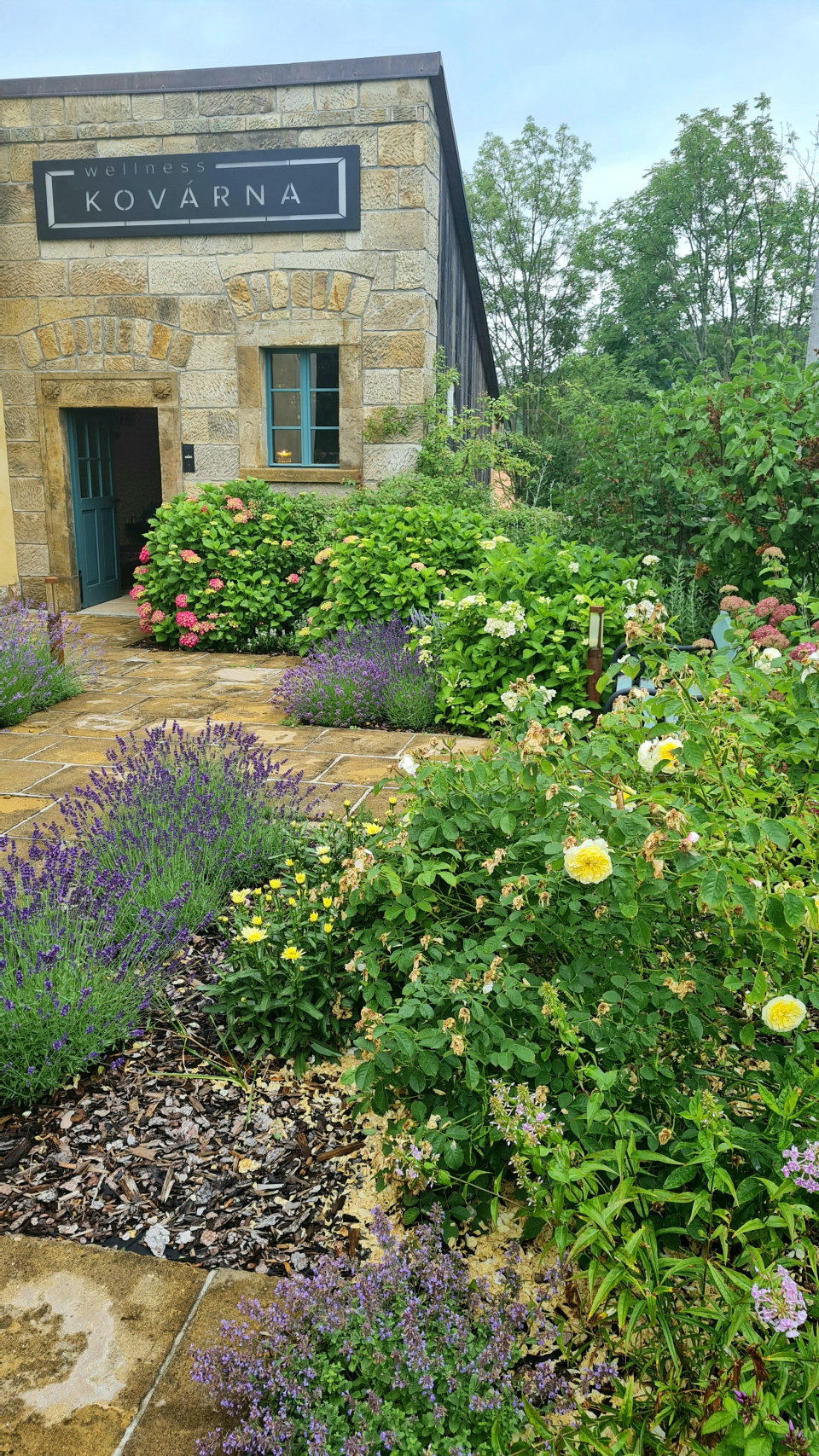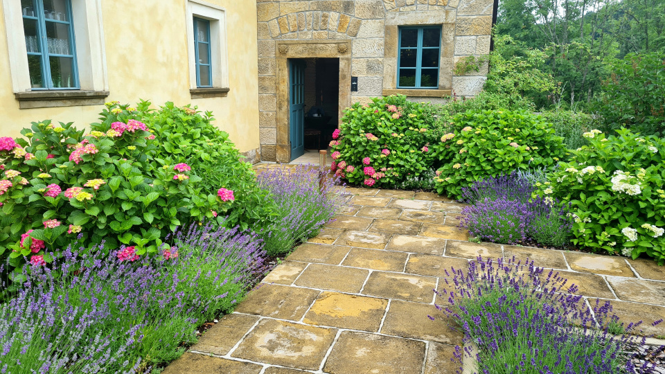 Kámen, levandule, hortenzie, modrá okna a dveře. Jedny ze základních prvků romantických zahrad.