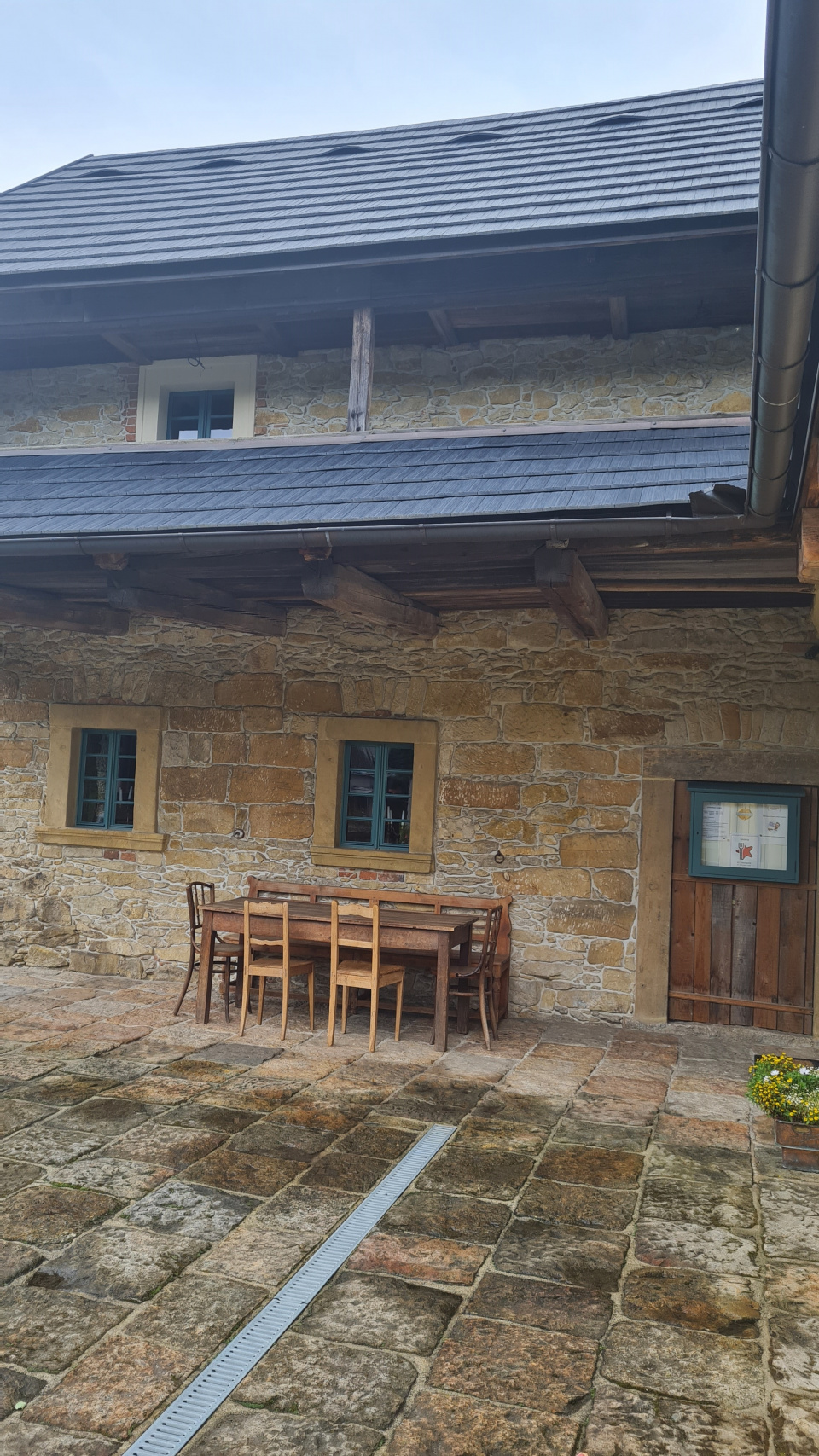 Pohled na zadní část zahrádky. Je právě po dešti, mokrá dlažba se vyrýsovala a dokonale ladí k pískovci na zdi restaurace.