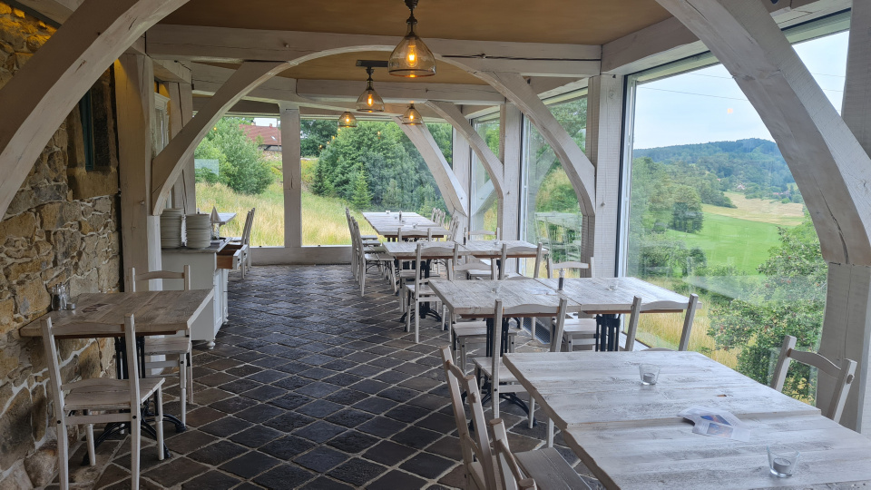 Interiér restaurace s krásným výhledem na okolní louky.