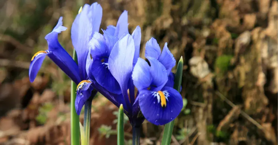 Kosateček síťkovaný s modrými okvětními lístky.