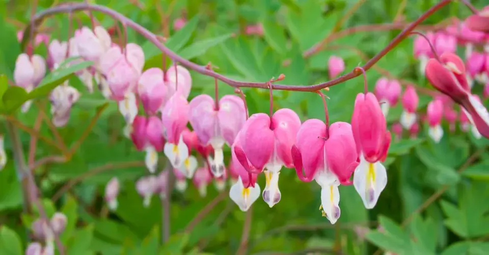 Srdcovka nádherná s řadou růžovo-bílých květů.
