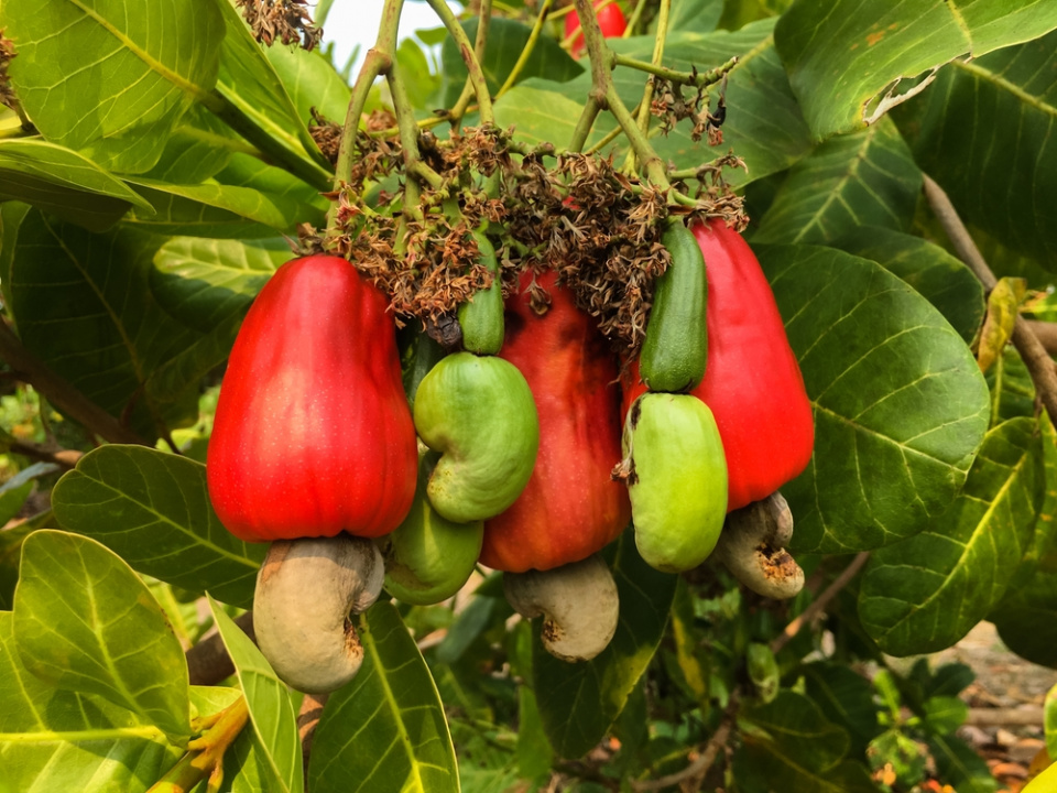 Každý kešu „oříšek“ má charakteristický tvar připomínající ledvinu a visí pod takzvaným kešu jablkem, červeným nebo žlutým ovocem, které je samo o sobě také jedlé