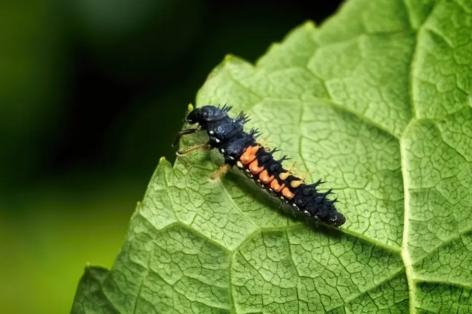Larvy slunéčka východního jsou černé s nápadnými oranžovými pruhy trnů po stranách, podobné ostatním druhům slunéček
