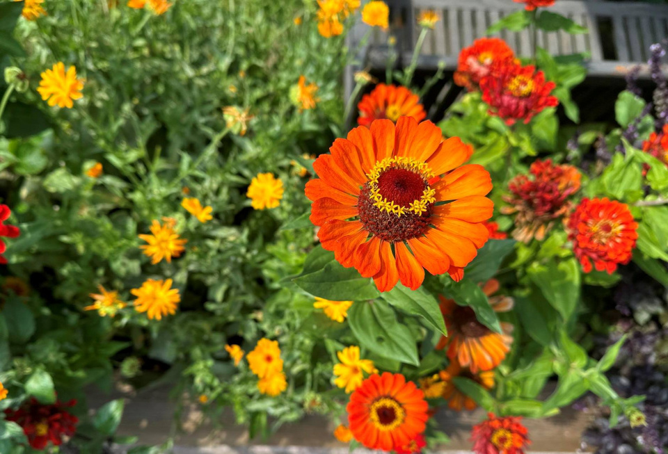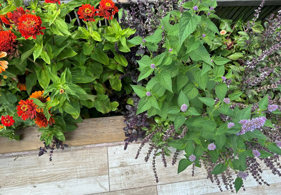 Cínie, bazalka i agastache v jednom záhonu poskytují hmyzu přímo královskou hostinu