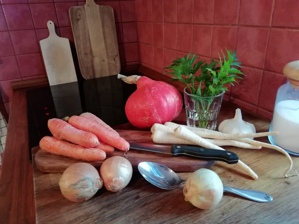 Mrkev spolu s kořenovou petrželí a cibulí vhoďte do hrnce s rozpáleným olejem. Zeleninu osmahněte klidně až jemně do zlatova. Přidejte na větší kusy pokrájenou dýni hokaido a ještě chvilku nechte opékat. Zalijte 1,5 l vody, osolte, opepřete a vařte asi 20 minut do změknutí