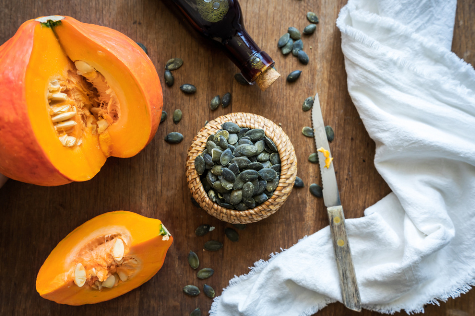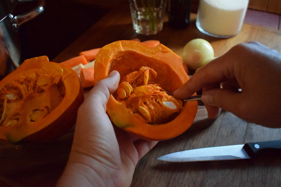 Dýni rozkrojte a vydlabejte všechna semena. Ta si můžete opražit na suché pánvi a připravit jako zdravé zobání, třeba k televizi