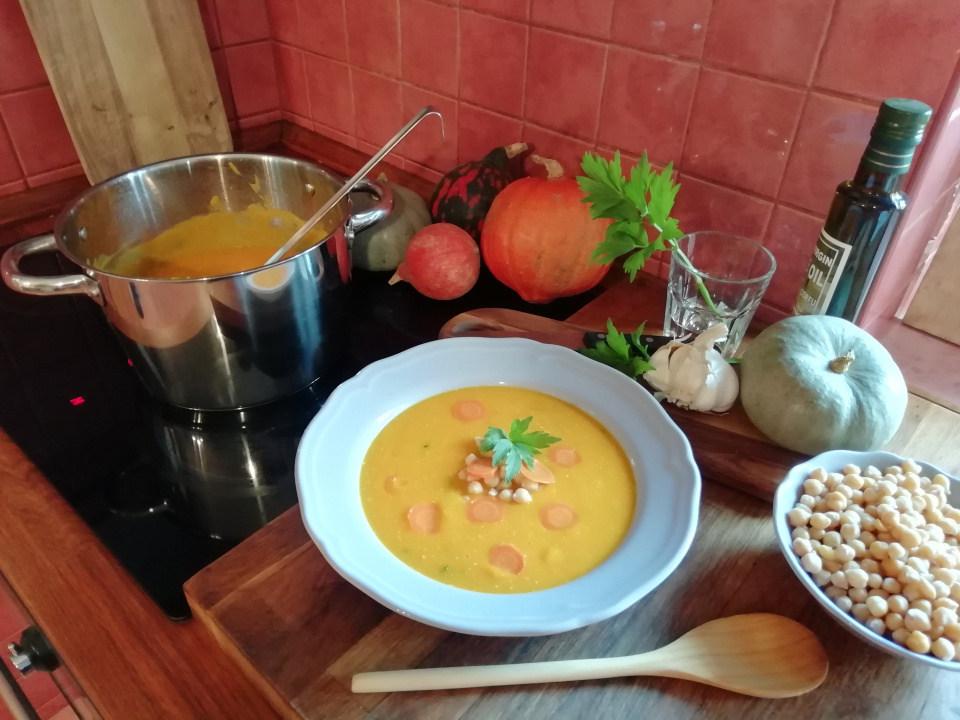 Do rozmixované polévky přidejte pokrájený libeček a poslední mrkev, pokrájenou na tenká kolečka. Pro zjemnění polévky můžete přidat i kousek másla. Do hotové polévky přidejte uvařenou cizrnu a už dále nevařte