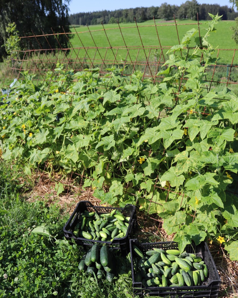Okurky mají dostatek vláhy v hlubinném záhonu ještě od jara, takže pěkně plodí a paní Ilona je nemusí zalévat.