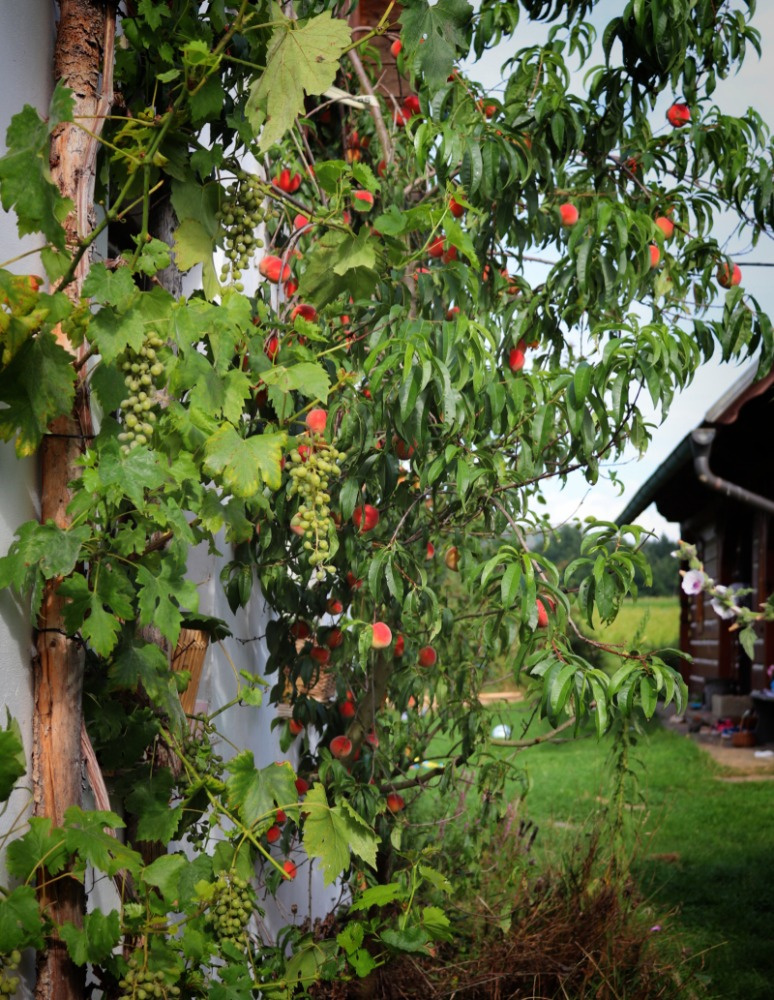 Jižně orientovaná stěna poskytuje teplo a ochranu broskvoni i révě vinné.