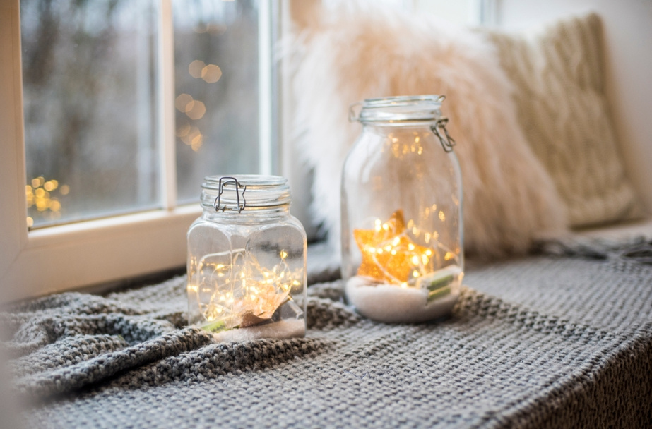 Svícen s LED řetězem: na tuhle dekoraci můžete využít i zavařovačky se skleněnými víčky a patentními uzávěry. Na rozdíl od zapálené svíčky, LED řetězu nebude chybět kyslík v uzavřené sklenici.