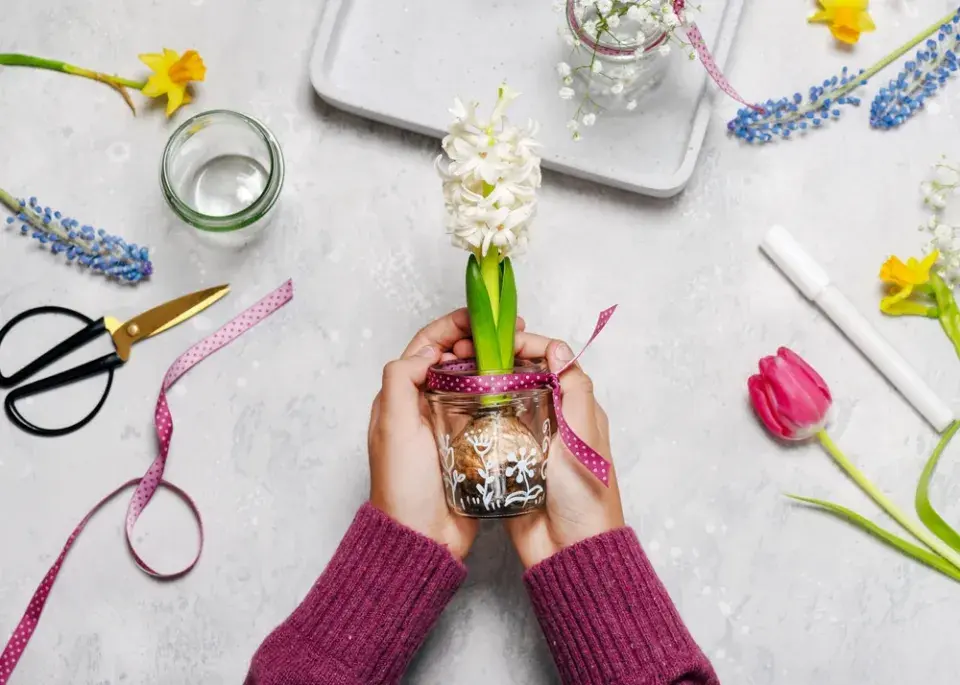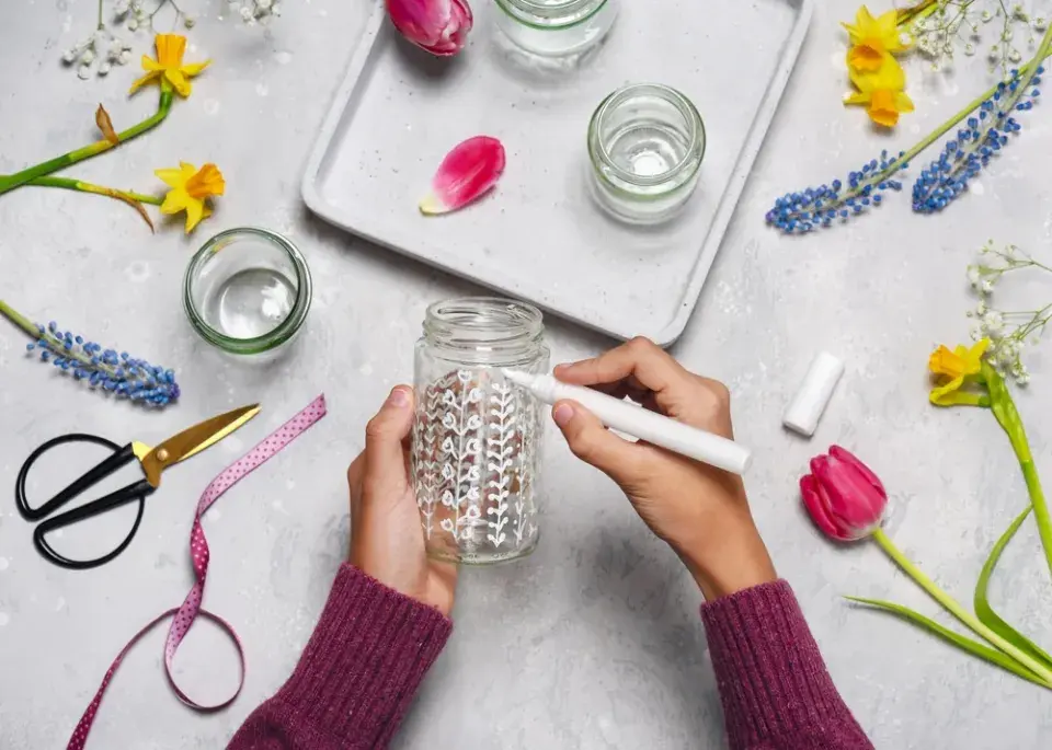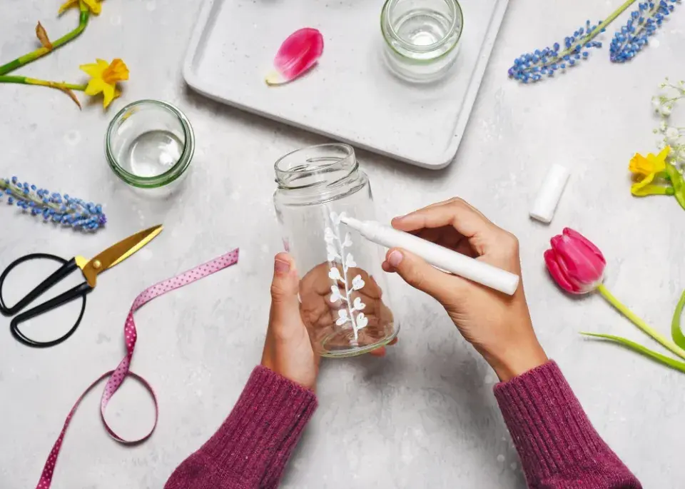 Když je malba hotová a zaschlá, ozdobte hrdlo sklenice stužkou. Můžete vytvořit jednoduchý uzel nebo mašli. Vybírejte barvy stužek tak, aby ladily s vaším interiérem i s květinami, které do vázy plánujete umístit