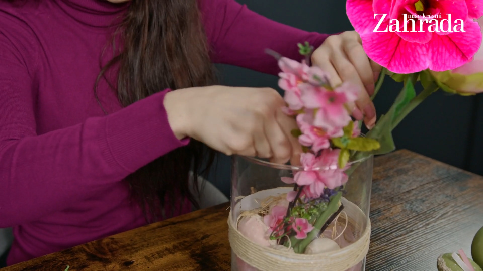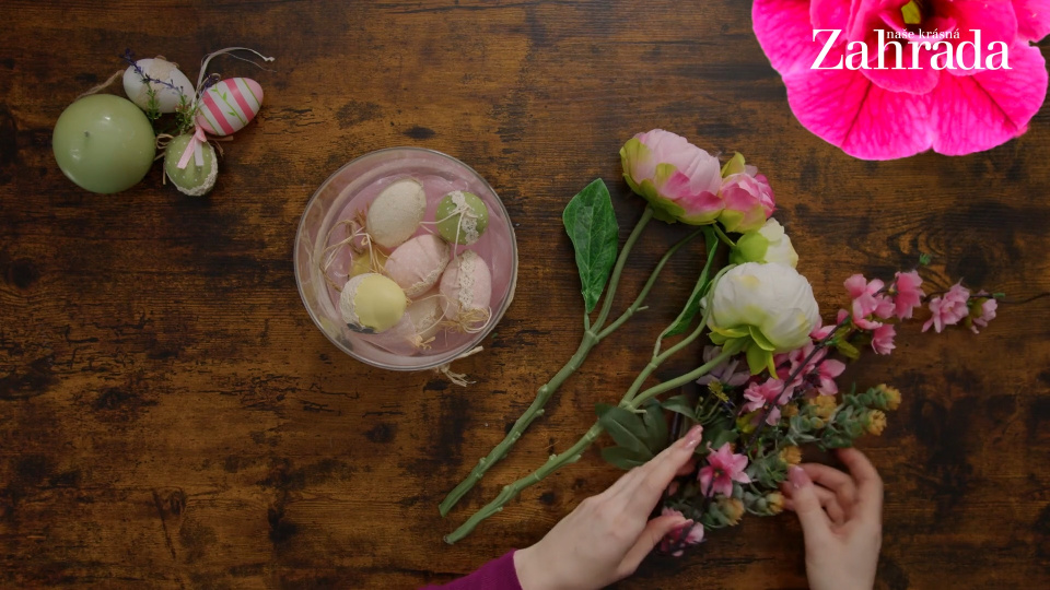 Umělé květiny vložte do vázy, stonky zapíchněte do organzy mezi vajíčka, květy by měly vykukovat z vázy