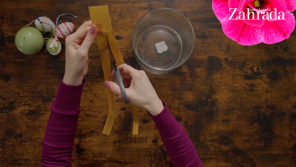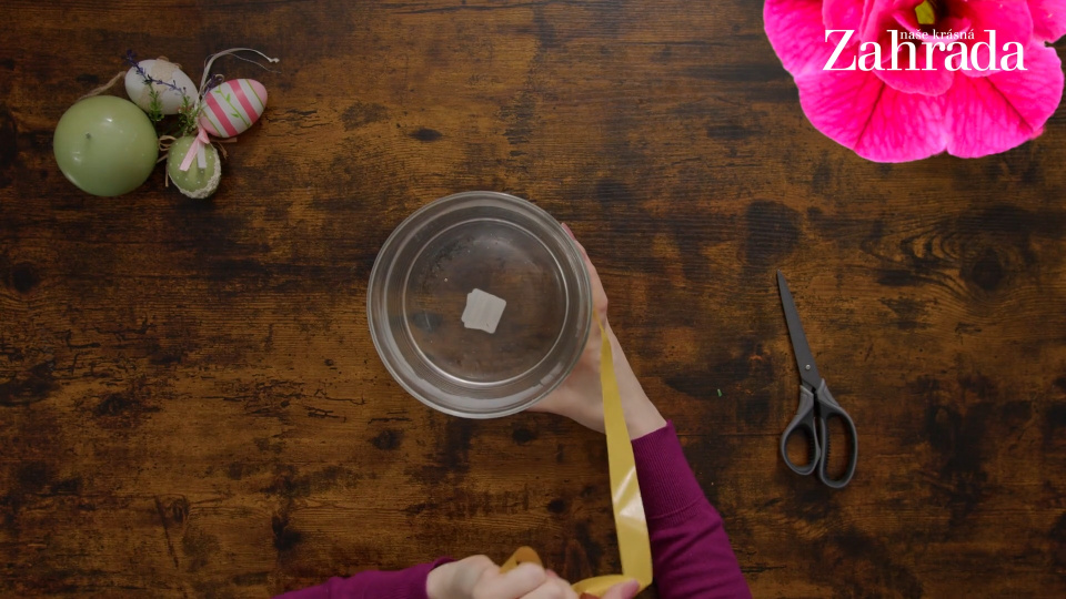 Co budete potřebovat? Připravte si širokou skleněnou vázu, oboustrannou lepenku, nůžky, provázek, umělé květiny, organzu, barevná dekorační vajíčka, drobné velikonoční dekorace (zajíčky a motýlky)