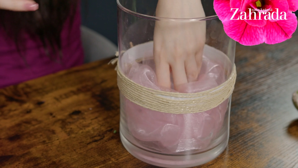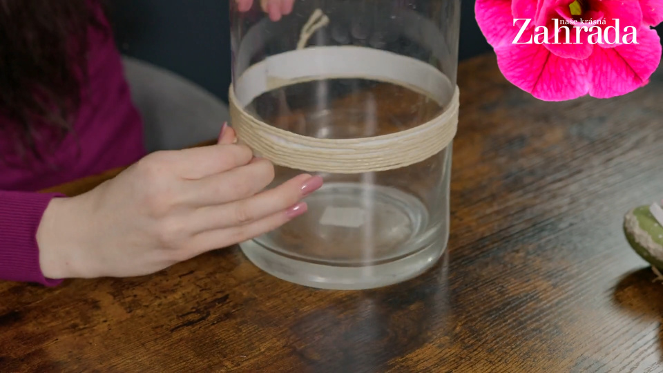 Připravte si vázu z čirého skla ve tvaru širokého válce. Položte ji na pracovní stůl a změřte si obvod vázy, abyste si ustřihli dostatečně dlouhý pruh oboustranné lepenky