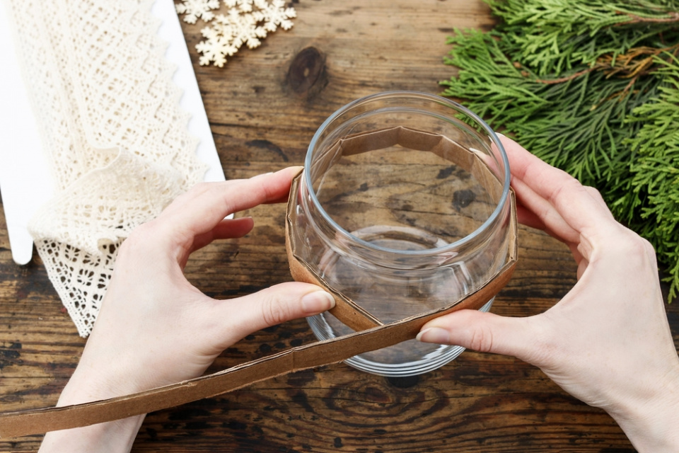 Proužek kartonu, polepený větvičkami, nalepte tavnou pistolí kolem sklenice