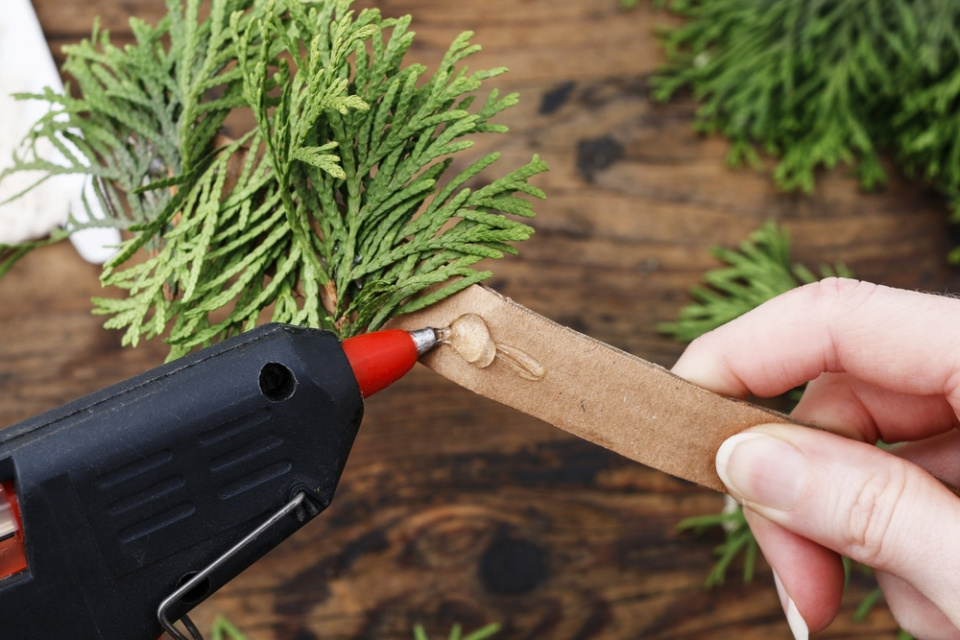 Z větví túje odstřihněte několik menších kousků, použijte nejpěknější vrcholové části větve. Odstřižené kousky túje začněte tavným lepidlem nalepovat na připravený pruh kartonu. Při nalepování střídejte směr větviček, jednu nalepte špičkou nahoru, druhou dolů
