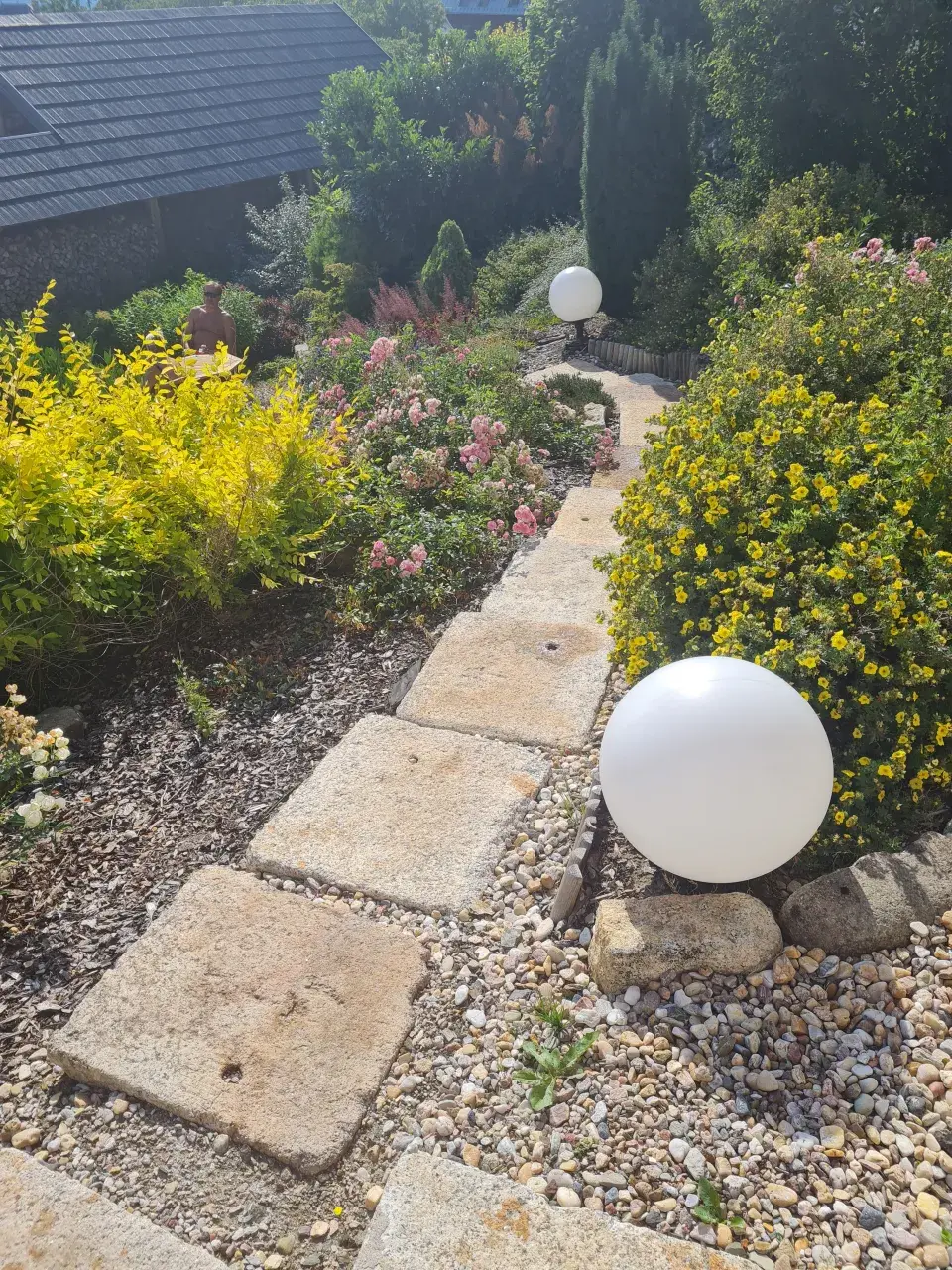 Pohled dolů ke slanému jezírku. Světelných lamp ve tvaru bílé koule je zde více, sjednocují zahradu. Na zimu se musí kvůli velkému množství sněhu uklízet.