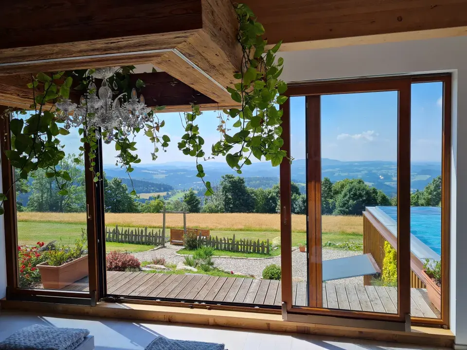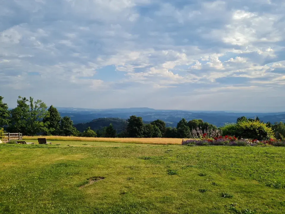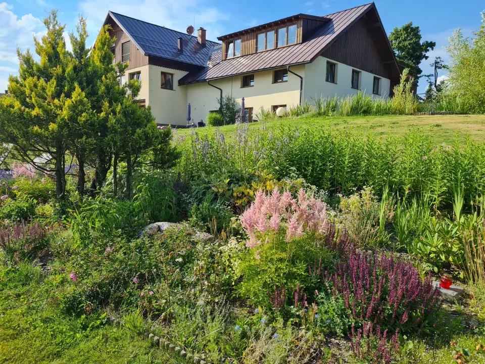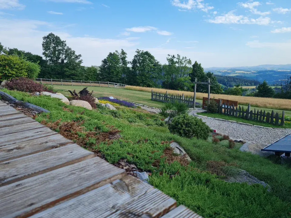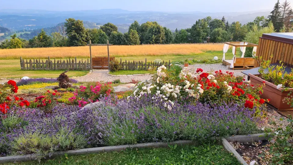 Pohled od spodní části hotelu, dříve louku „sekaly“ ovce, nyní se snaží louku obnovit a nechat rozkvést.