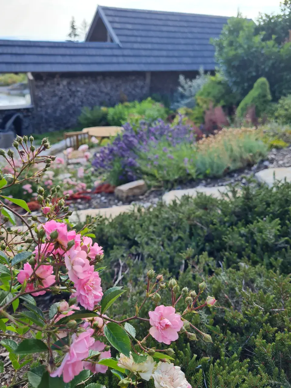 Rybíz a angrešt přirozeně zapadá do výsadby, na první pohled bychom si ani nevšimli, že se nejedná o okrasnou rostlinu. Svah je pokrytý promyšlenými koberečky stejných rostlin tak, aby po celý rok vypadal zajímavě.