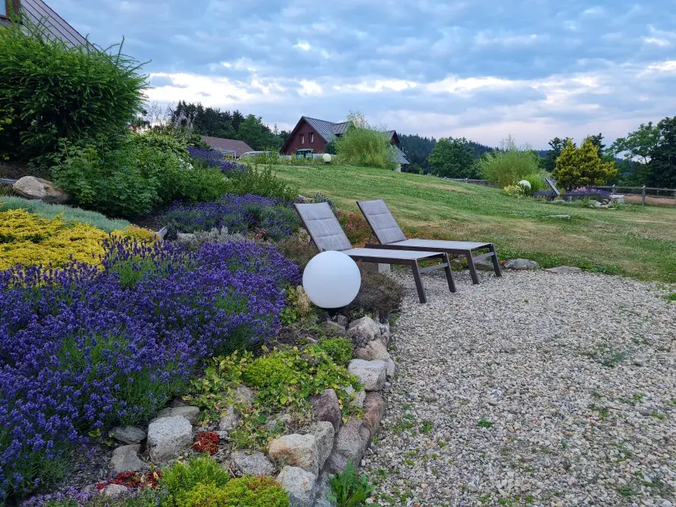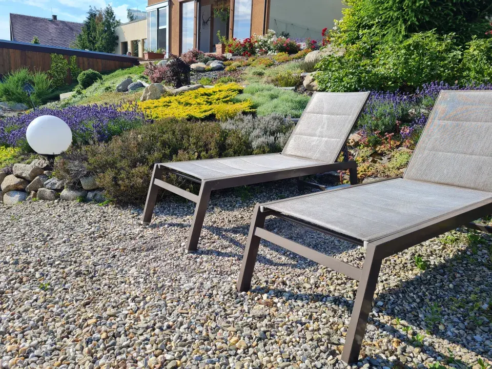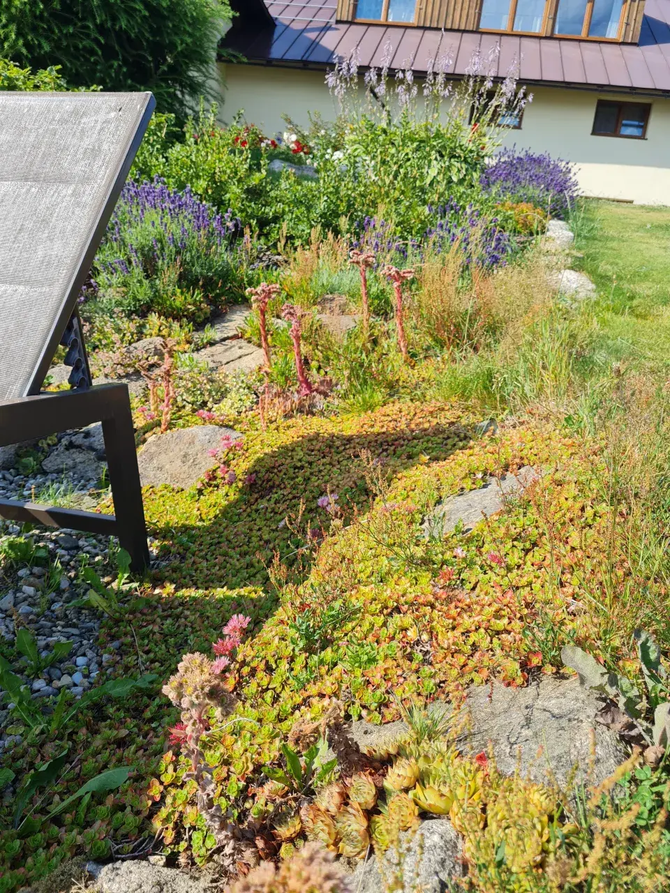 Lehátka k odpočinku na sluníčku vedle barvami hrajícími, ač nekvetoucími, koberečky rostlin.