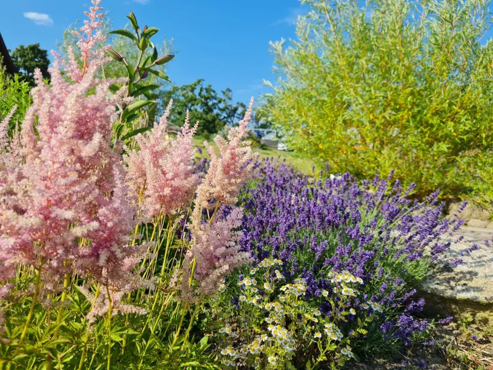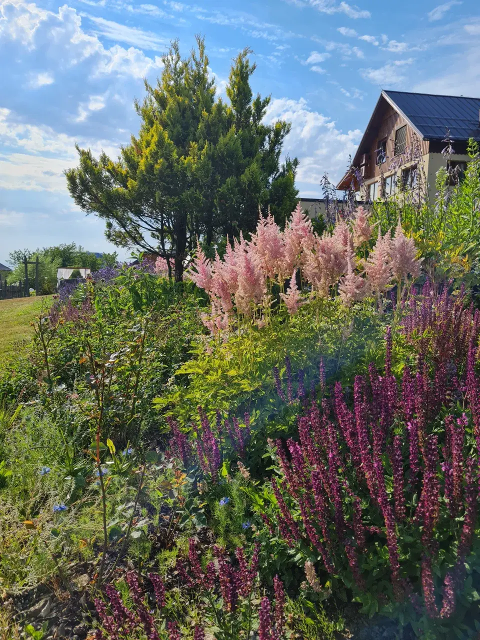 Záhon je krásný v každém období, nyní vedou čechravy, šalvěje, levandule a hosty, postupně se přidají floxy a třapatky, máky, rododendron a jarní květiny jsou již odkvetlé.