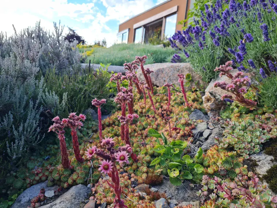Netřesky a dalšími skalničkami pokrytá zídka. Celá jen bzučí.