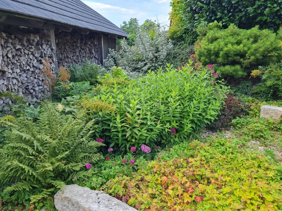Jedna ze starých tújí vypovídá o svém stáří. Tento záhon vznikl rozsazováním trvalek a bylin, jako na zbytku zahrady tu rostou hezky smíchané pospolu okrasné i užitkové rostliny.