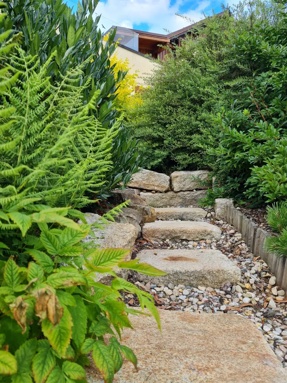 Kamenné nášlapy ze staré svárovské tkalcovny. Cestu nahoru lemují kapradiny, nižší bobkovišně nebo například ptačí zob.