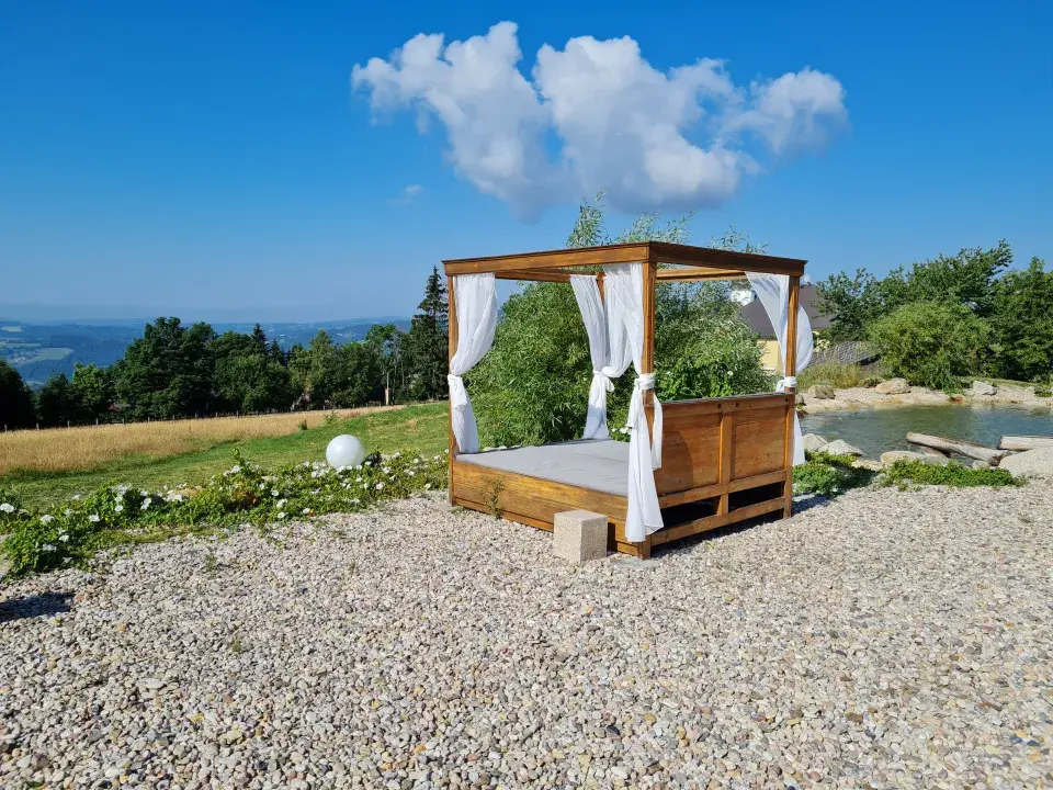 Pohled ke slanému jezírku na odpočívací postel s nebesy jemně vlajícími za větru.