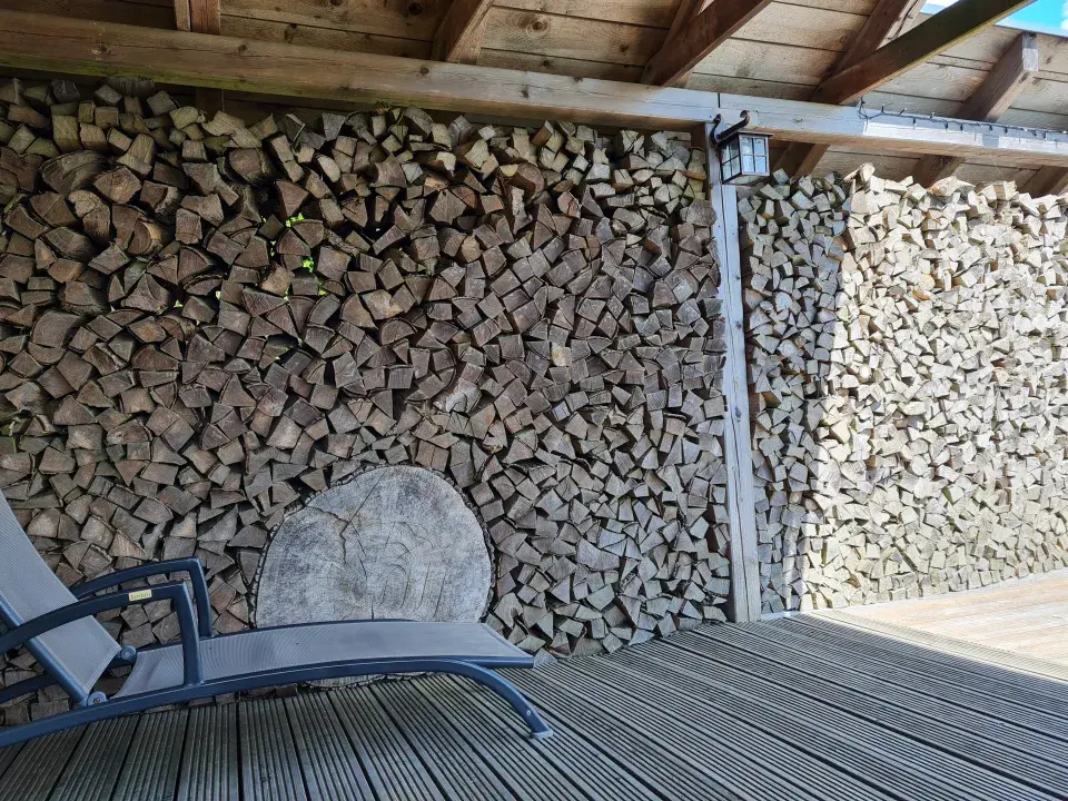Soukromí vedle sauny u ochlazovací bazénku tvoří zástěna vyskládaná z polen.