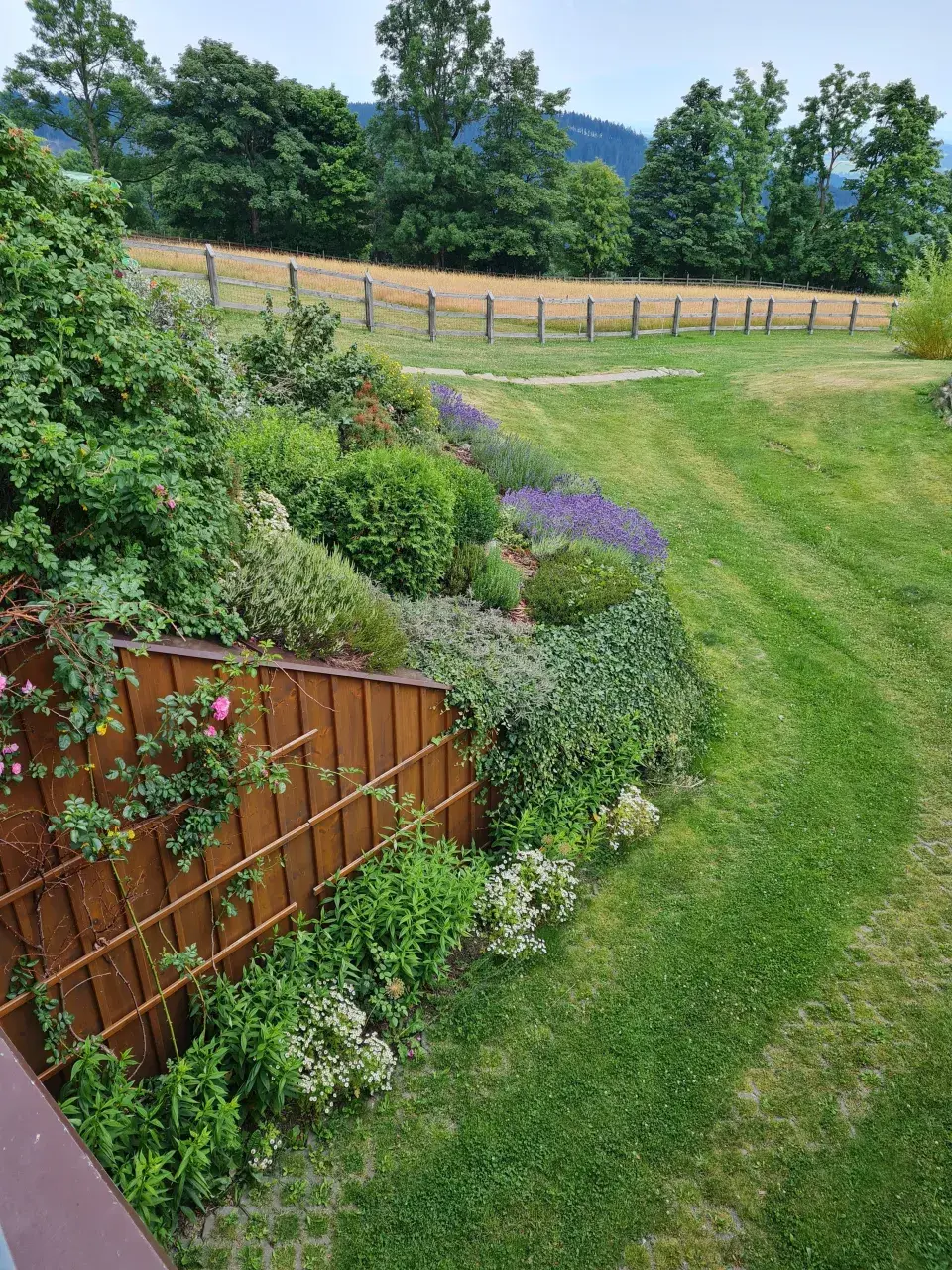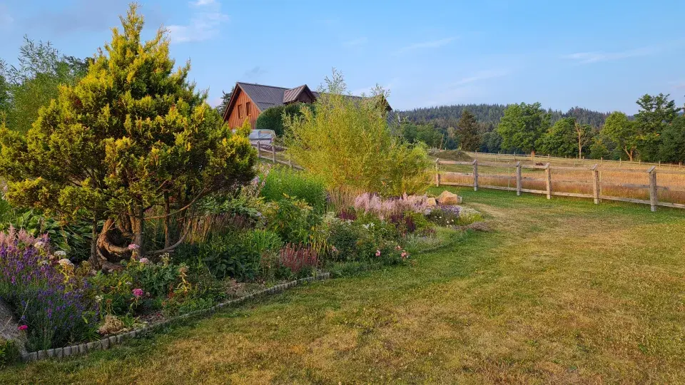 Bylinková zahrádka dole byla dříve oplocená celá, což působilo poměrně stísněně. Stejně tak se posunul plot u louky. Celkový pohled nyní vypadá otevřeně a volně, při západu slunce naprosto dokonale.