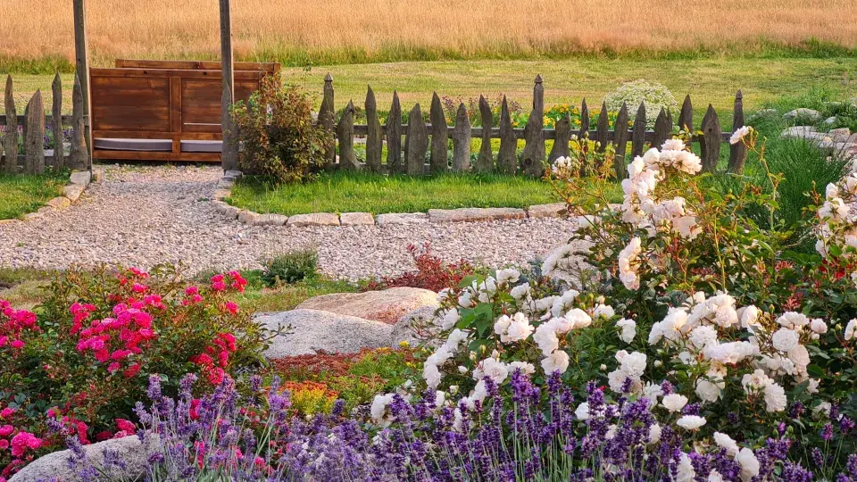 Cestičku po schodech lemují růžičky a levandule, průchod jím nabízí spoustu barev i vůně.