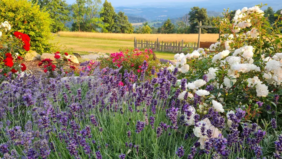 Růžový záhon s levandulí. Růže se střídají v odstínech červené, růžové i bílé.