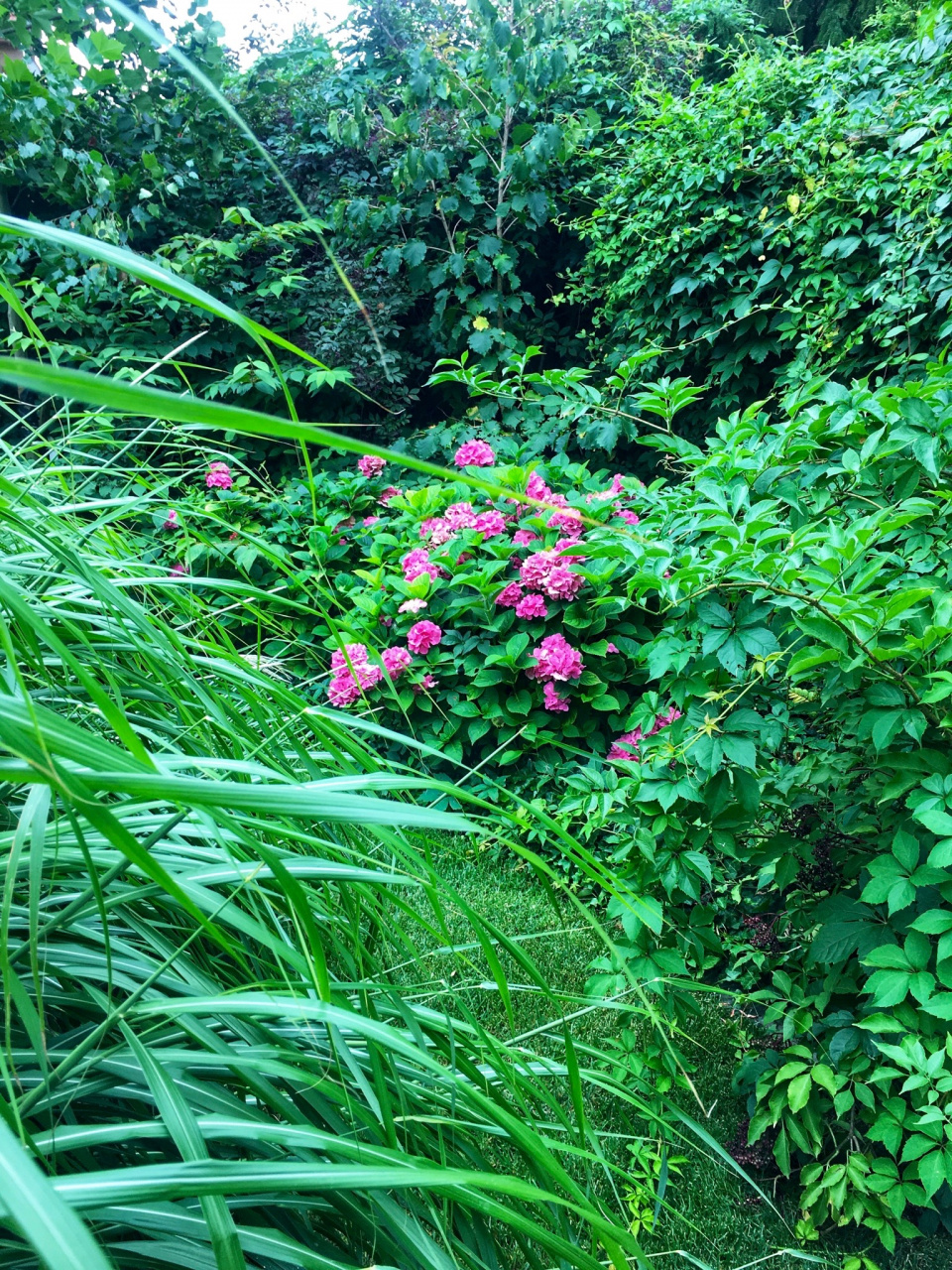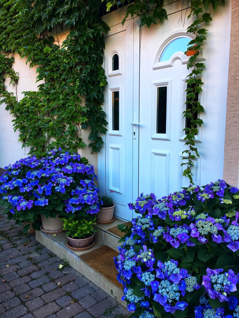 Hortenzie, oblíbené rostliny paní Anky, nechybí ani u vstupních dveří do domu.